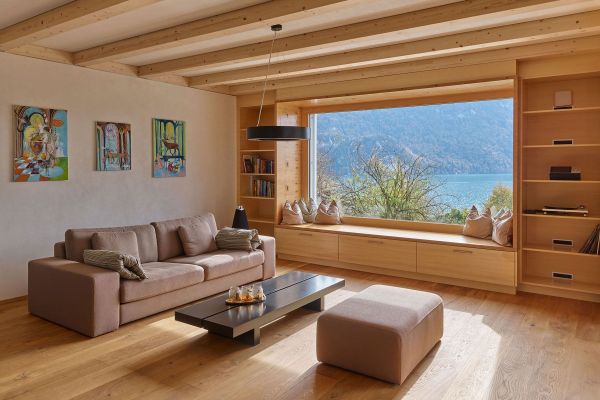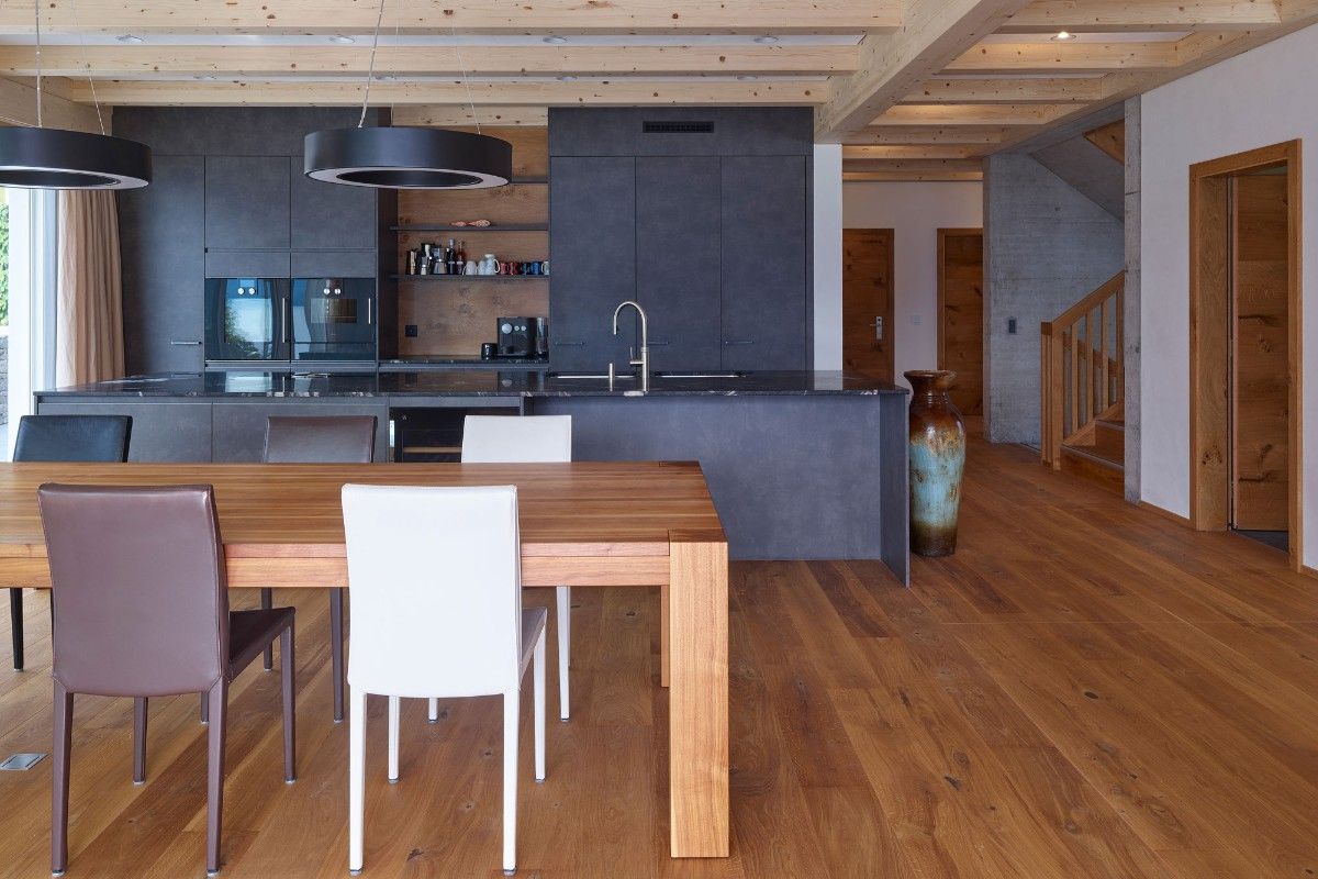 Wohn-, Koch- und Essbereich wurden im Erdgeschoss als ein grosser, zusammenhängender Raum gegen Süden und Westen orientiert, um eine optimale Aussicht auf die Landschaft zu ermöglichen. Ein geschützter Aussenbereich erweitert den Wohn-und Essbereich und ermöglicht das Verweilen im Freien auch bei schlechtem Wetter.