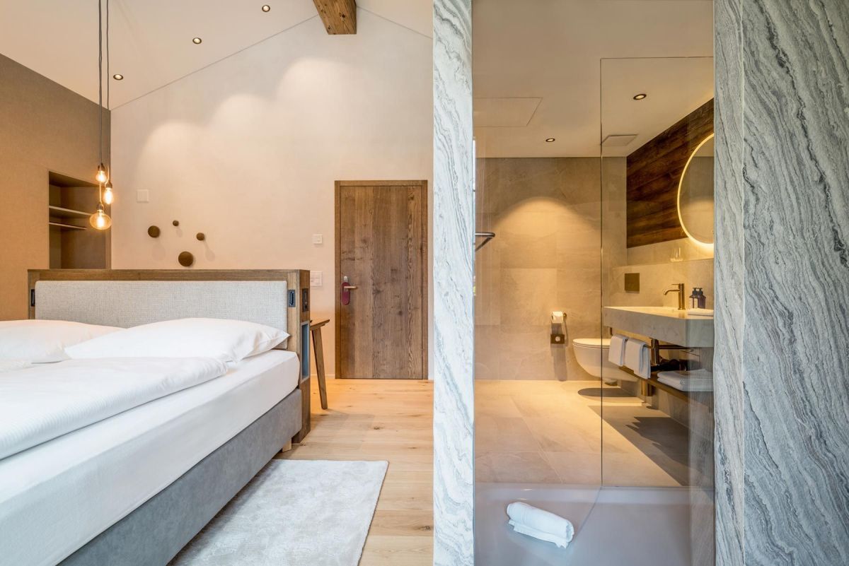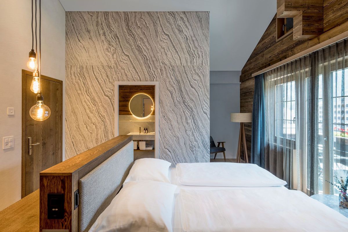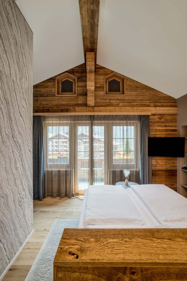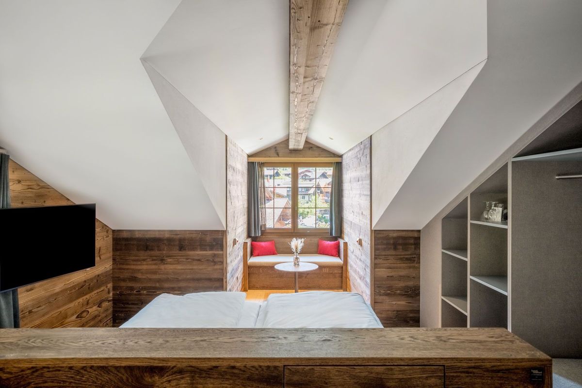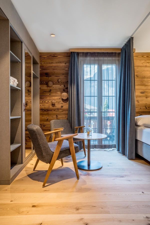 Neu umfasst das Chalet acht Doppelzimmer und zwei Suiten. Gestalterisch verbindet die Innenarchitektur traditionellen alpinen Stil mit zeitgemässem Komfort. Lokale Materialien wie Massivholz, Naturstein und Echtsteinfurniere prägen das Raumkonzept. Die langjährige Tradition des Parkhotel Schönegg spiegelt sich im Design wider: etwa in Form einer Tapete mit Gletschermotiv und handwerklich gefertigten Holzelementen.