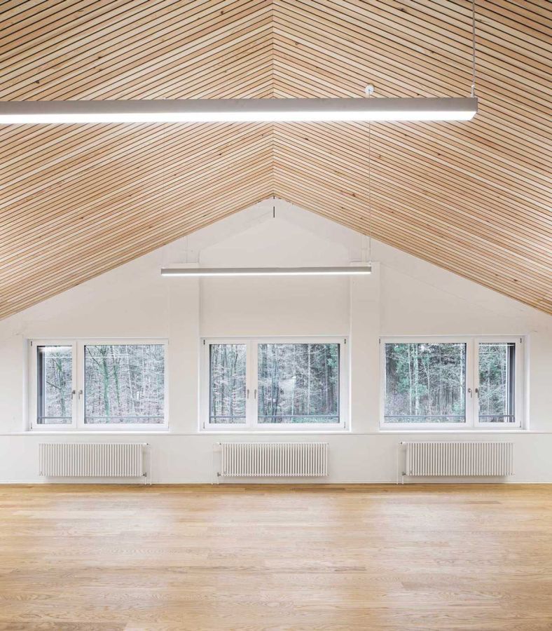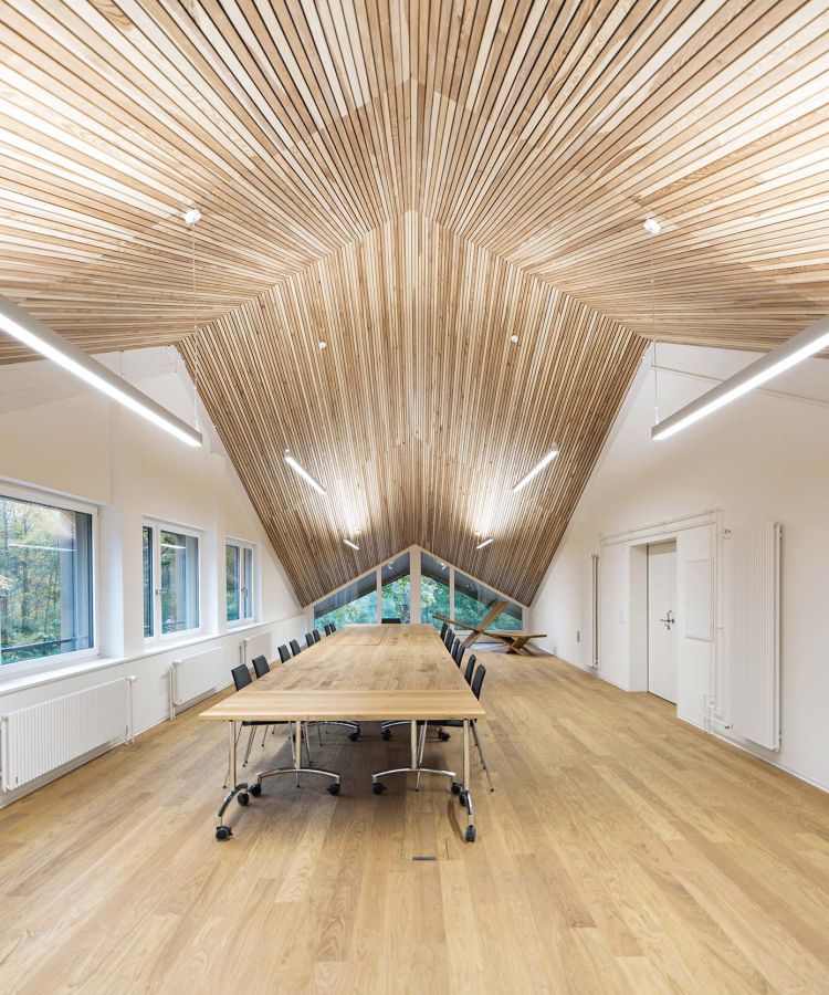 Beim Umbau und der Sanierung war die historische Architektur genauso zu berücksichtigen, wie die Adaption auf die modernen Betriebsabläufe sowie die energetische Sanierung der Gebäudehülle. Neu beherbergt das Gebäude Büros und Sitzungszimmer, Werkstätte, Lagerräume sowie Aufenthalts- und Sanitärräumlichkeiten. Mit der zurückhaltenden Gestaltung der Innenräume, geprägt durch den Werkstoff Holz, wird sowohl der Nutzer Forstbetriebe als auch die einzigartige Gebäudearchitektur sichtbar.