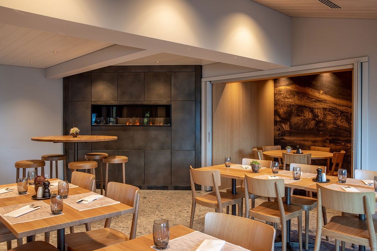 Durch mehrfache An- und Umbauten am Gebäude waren der Grundriss verwinkelt, die Raumhöhe niedrig und die Bodenniveaus differenziert. Das Angleichen der verschiedenen Bodenniveaus sowie die Reduzierung der statischen Elemente auf ein notwendiges Minimum, vereinheitlichte den Grundriss und gestaltete diesen ruhiger. Die teilweise Öffnung der Decke des Restaurants vergrösserte die Raumhöhe und öffnet das Restaurant von hinten nach vorne sinnbildlich einer Höhle.